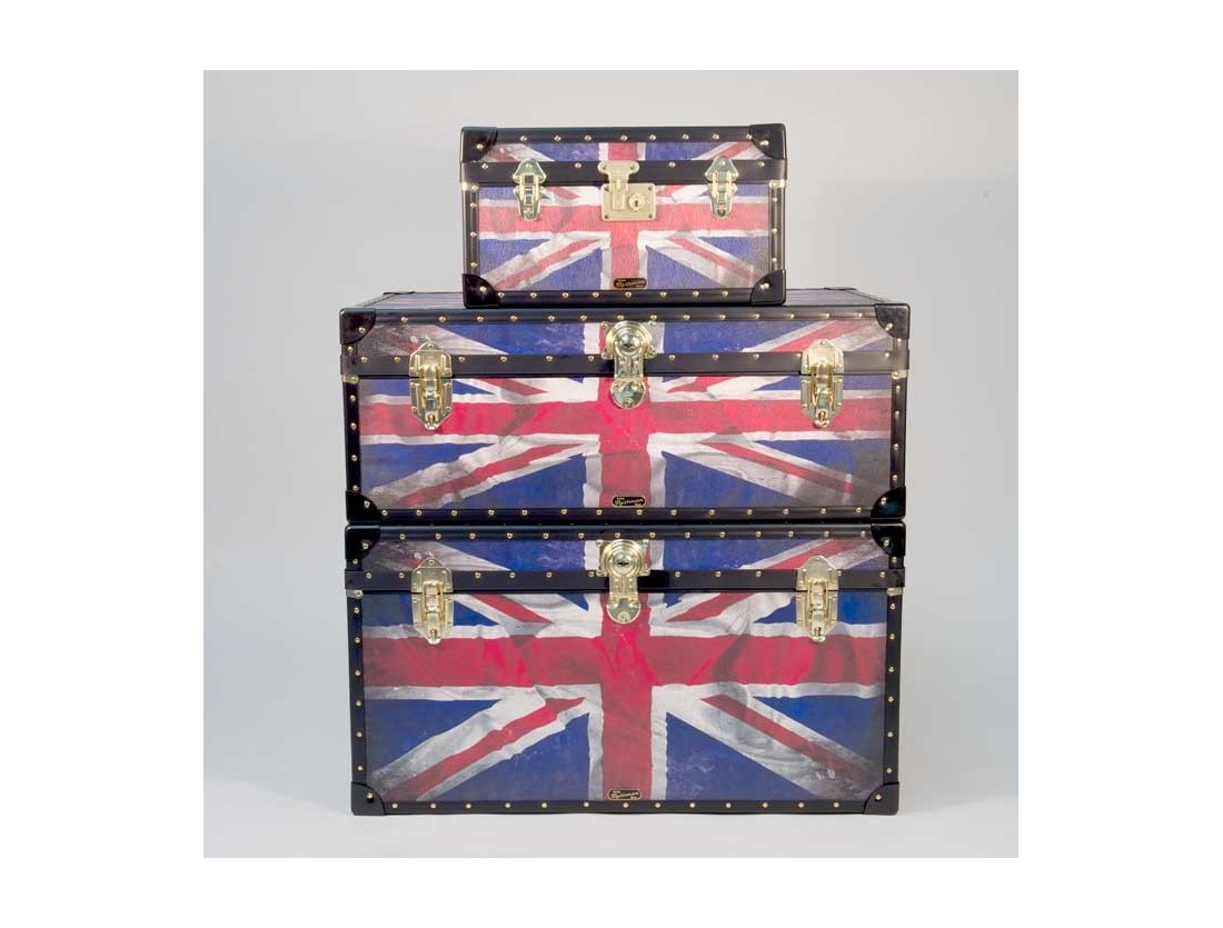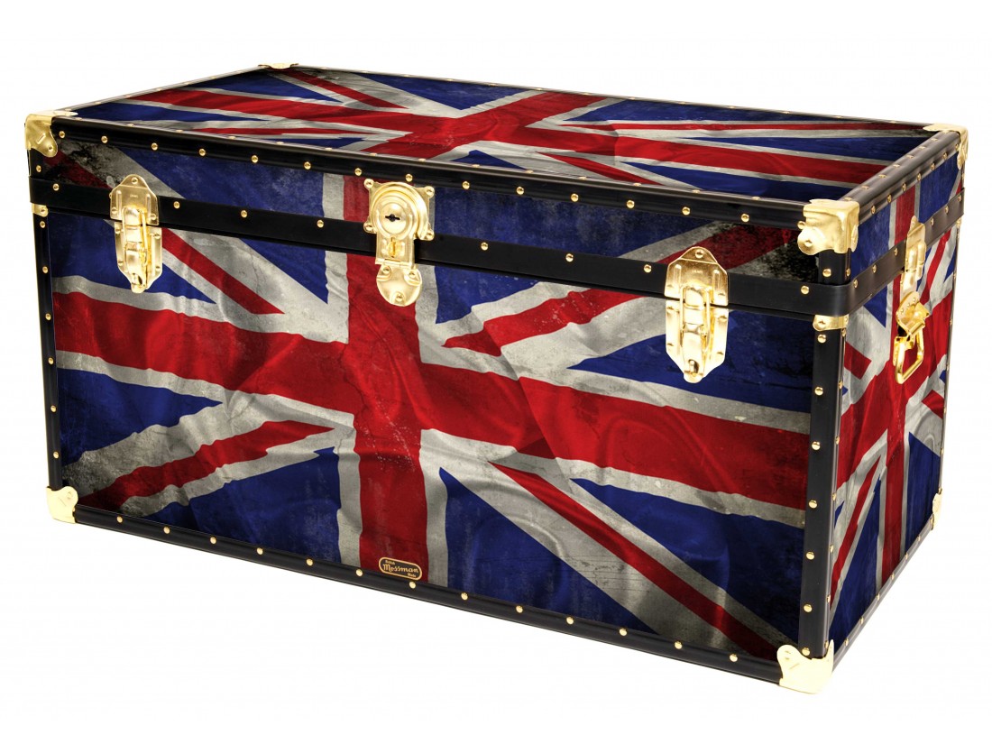 A patriotic union jack Traditional queen size storage trunk with central cabin lock.  Vintage style storage trunks for the home and boarders at schools.  Supplied with two keys.  Approximate external dimensions 40" x 20" x 20".  252 litres capacity.  11kg in weight. With the option to personalise your name within the print of this queen trunk.
