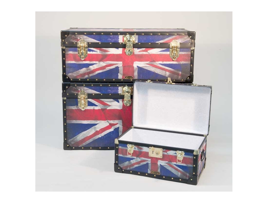 Constructed from the highest quality 5.5mm plywood, which is bonded to a patriotic union jack printed vinyl. With a hinged stay lid, carry handles each end, two padlockable catches and a paper lined interior.  Approximate internal dimensions 995mm x 495mm x 490mm. The number one choice in boarding school luggage trunks, chests and storage trunk solutions.