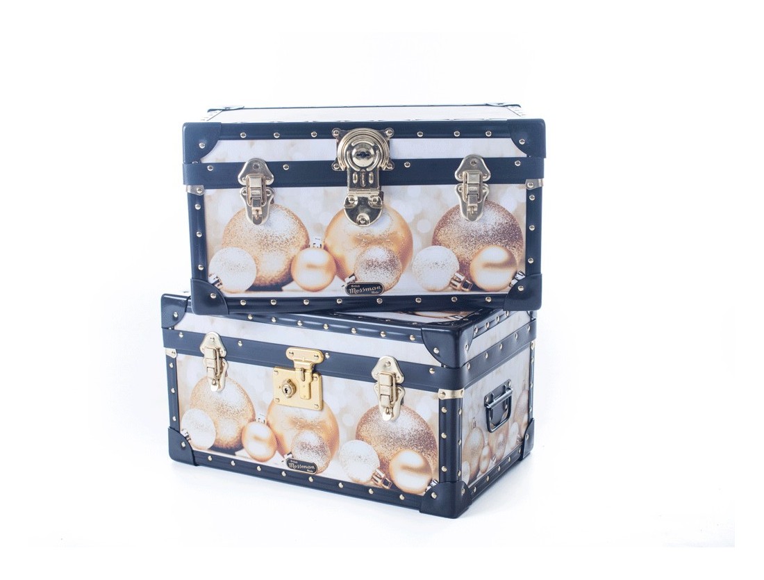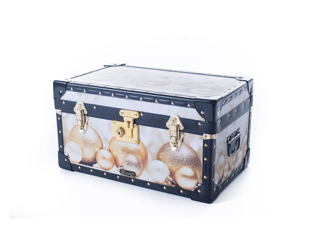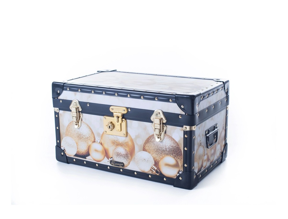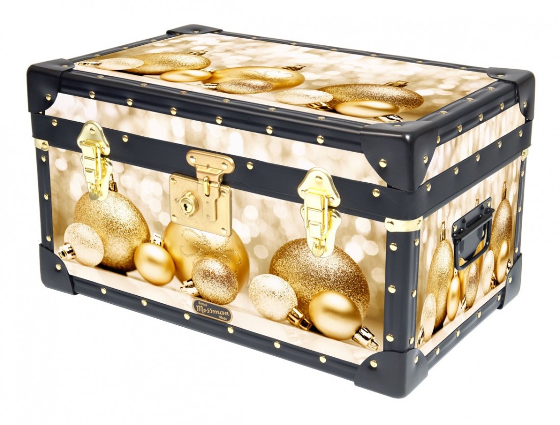 A Christmas special gold baubles traditional boarding school Tuck Box with central flip lock.  Supplied with two keys.  Approximate external dimensions 20" x 13" x 11".  47 litres capacity.  4kg in weight.  An ideal gift for Christmas, and a great alternative to a Chrismas stockings  Fill this Tuck Box with gifts and sweets.