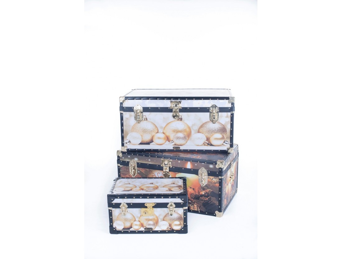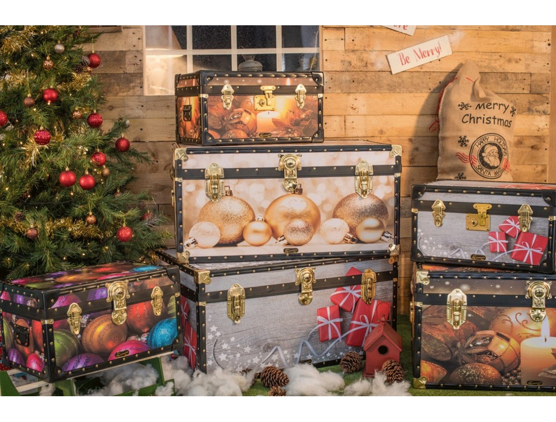 Constructed from the highest quality 5.5mm plywood, which is bonded to a Christmas themed printed vinyl. With a hinged stay lid, carry handles each end, two padlockable catches and a paper lined interior.  Approximate internal dimensions 500mm x 300mm x 260mm.  The number one choice in boarding school Tuck Boxes, luggage chests and storage trunk solutions.