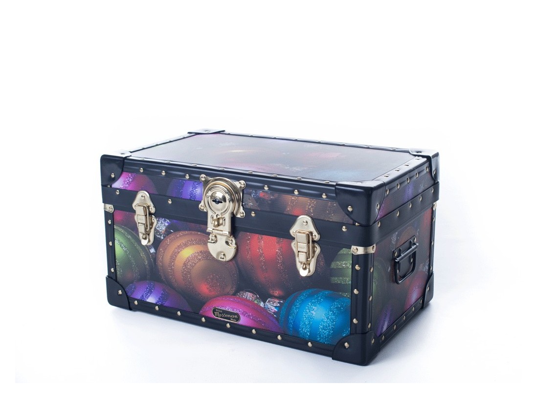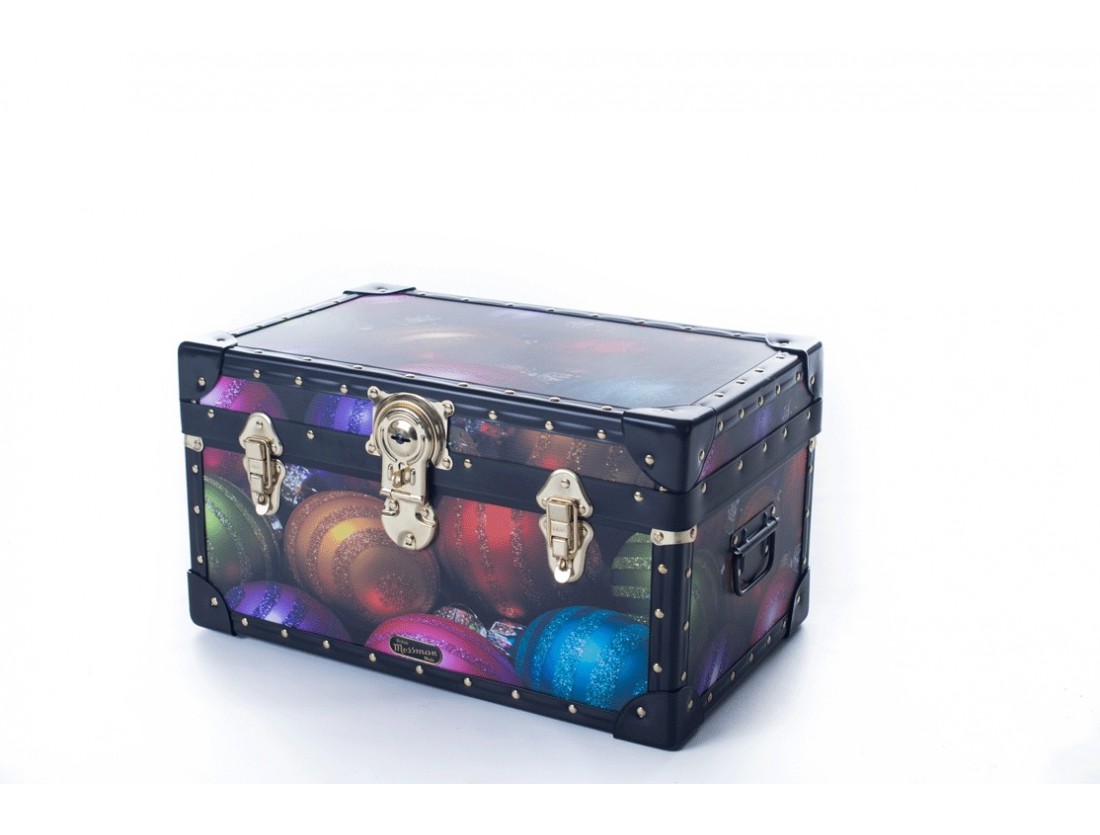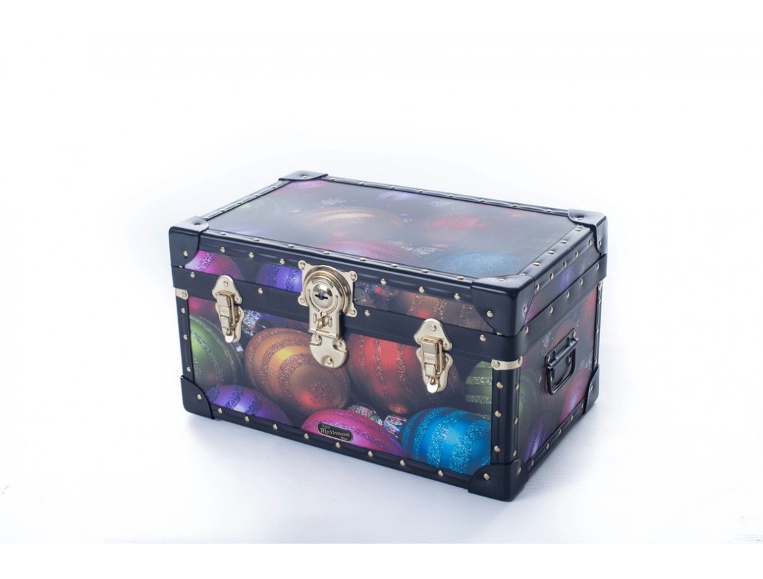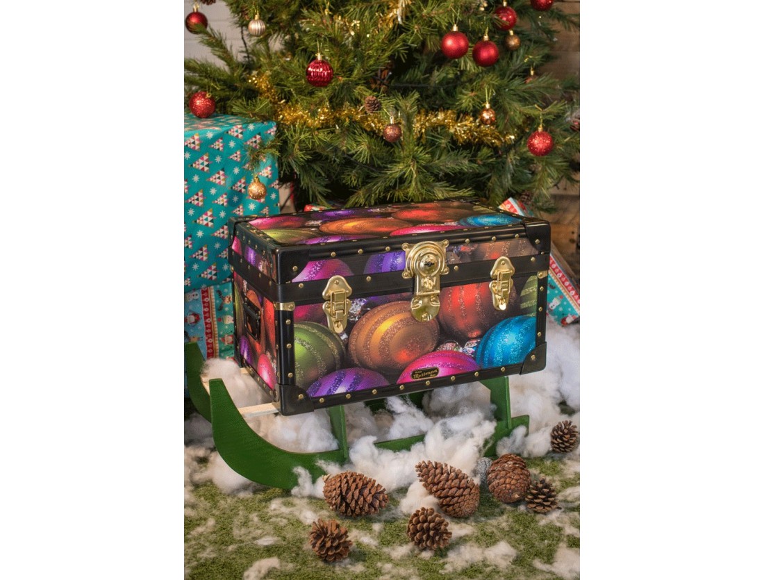 A Christmas special coloured baubles traditional boarding school Tuck Box with central cabin lock.  Supplied with two keys.  Approximate external dimensions 20" x 13" x 11".  47 litres capacity.  4kg in weight.  An ideal gift for Christmas, and a great alternative to a Chrismas stockings.  Fill this Tuck Box with gifts and sweets.