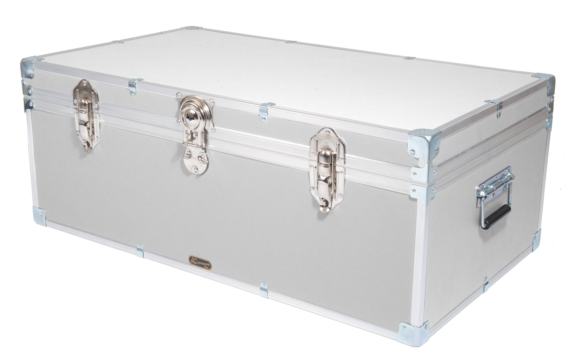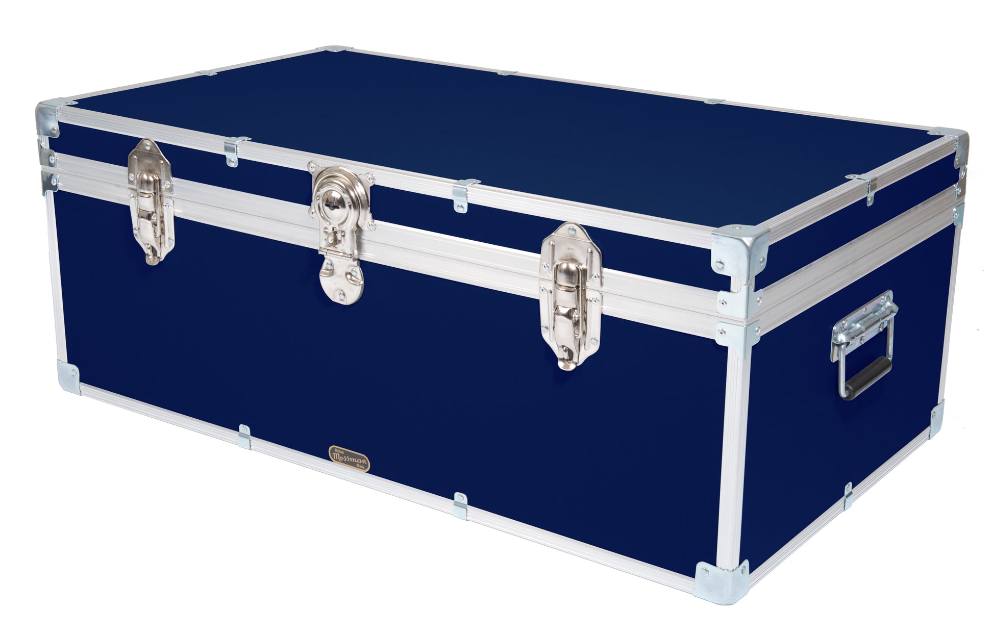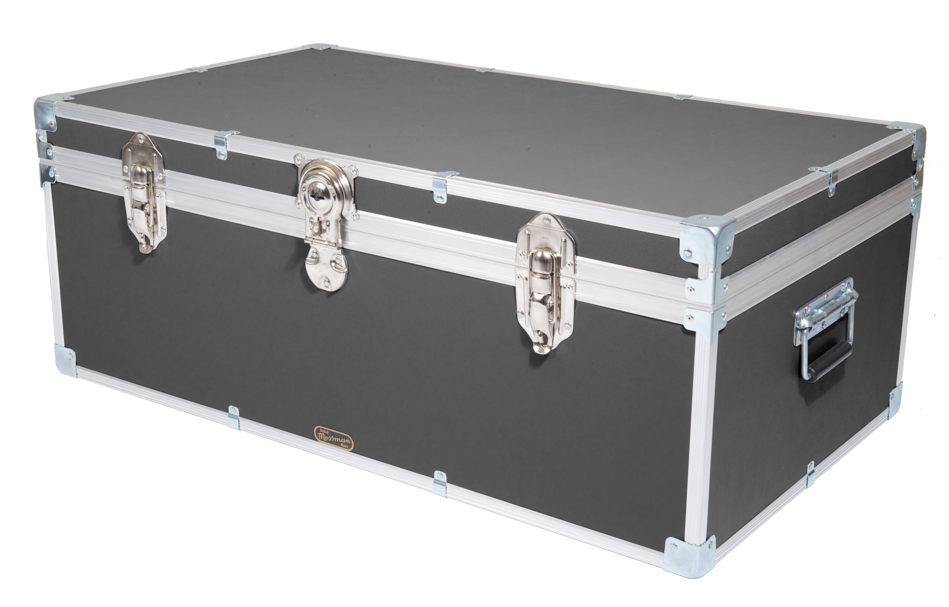 With a central cabin lock, hinged stay lid, carry handles each end, two padlockable catches and a paper lined interior. The timber frame of our industrial tuck boxes and trunks are pinned and glued together before the aluminium edging is added to make them the strongest they can be. Mossman Trunks is the number one choice in boarding school Tuck Boxes, luggage chests and storage trunk solutions.