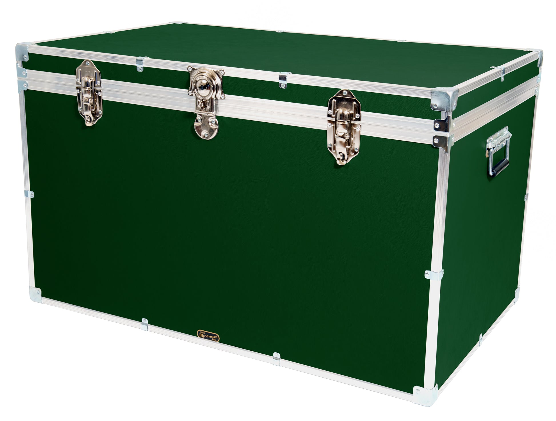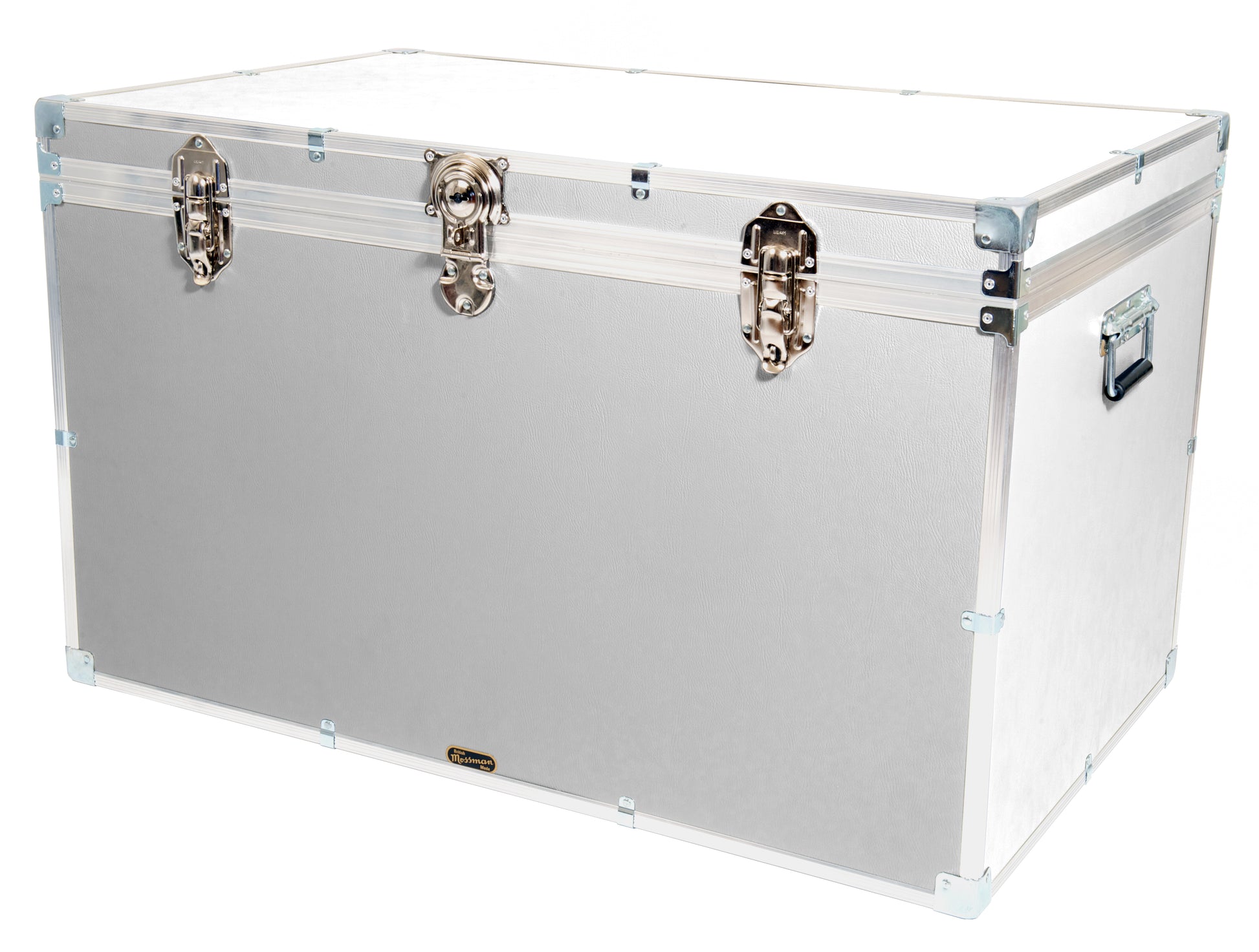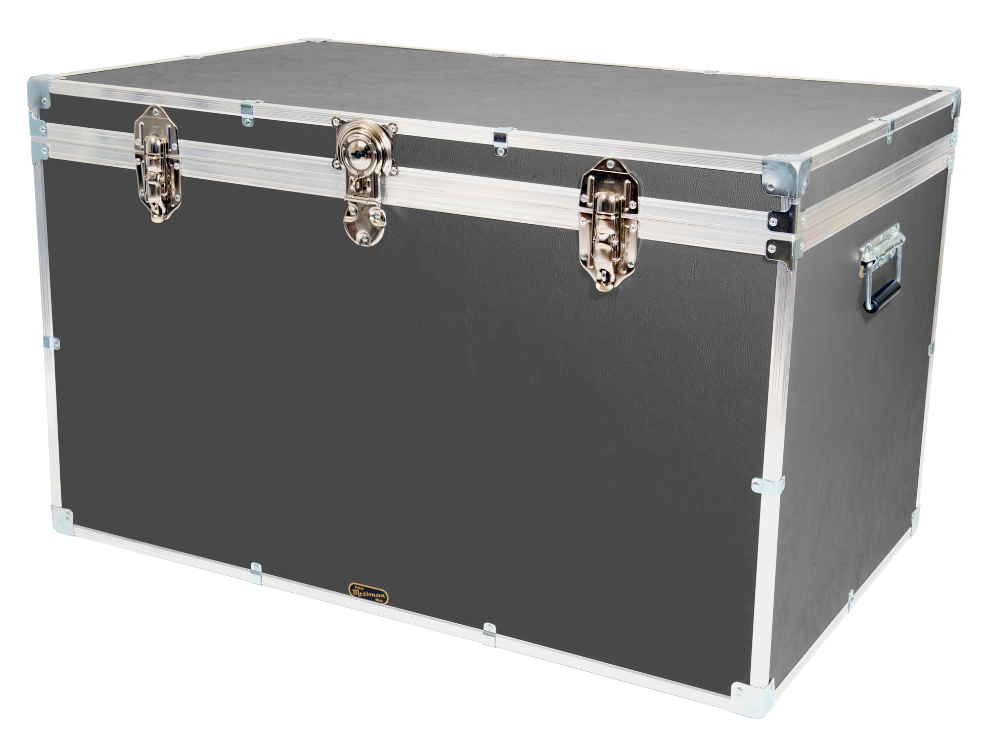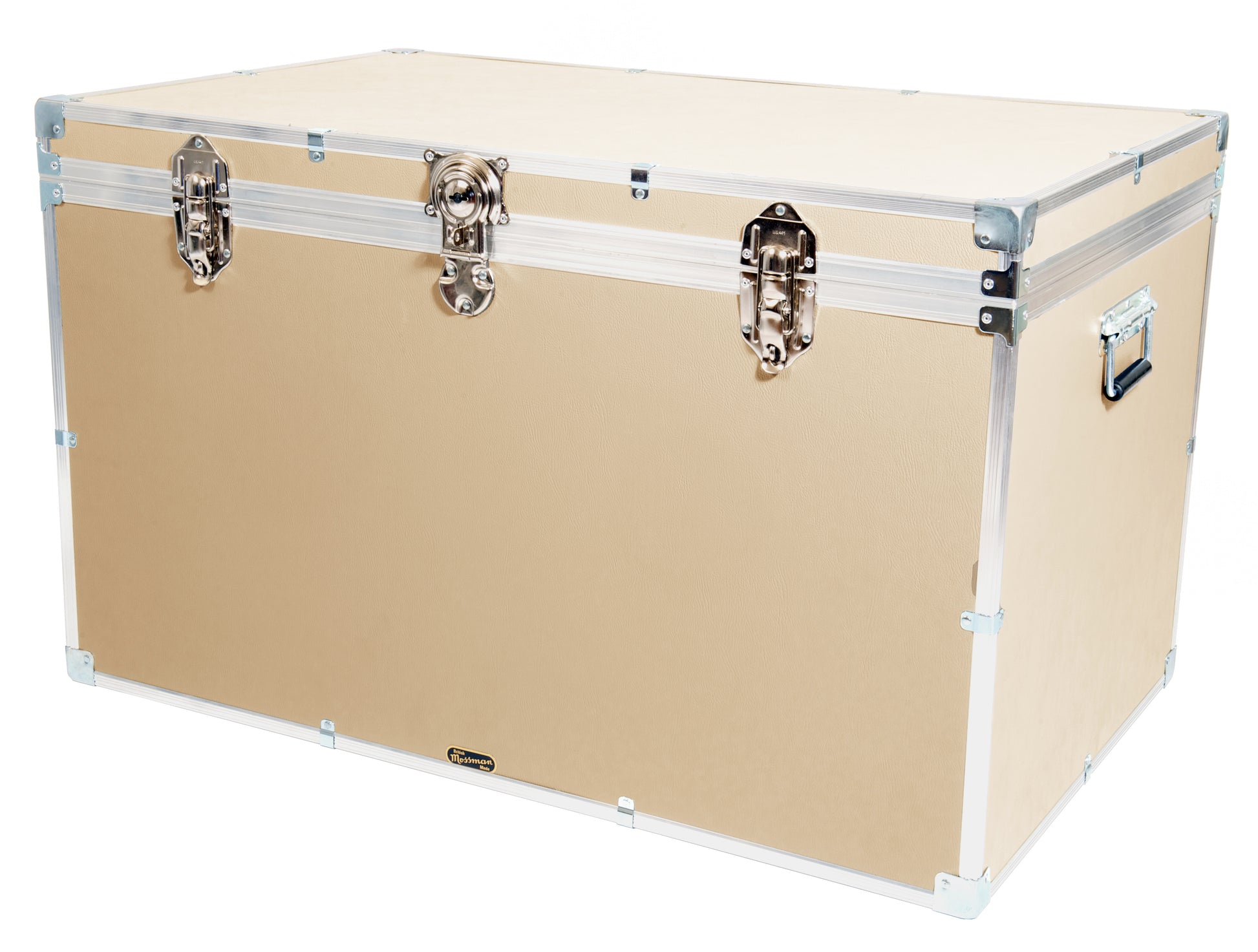 With a central cabin lock, hinged stay lid, rubber grip sprung carry handles to each end, two padlockable catches and a paper lined interior. The timber frame of our industrial tuck boxes and trunks are pinned and glued together before the aluminium edging is added to make them the strongest they can be. Mossman Trunks is the number one choice in boarding school Tuck Boxes, luggage chests and storage trunk solutions.