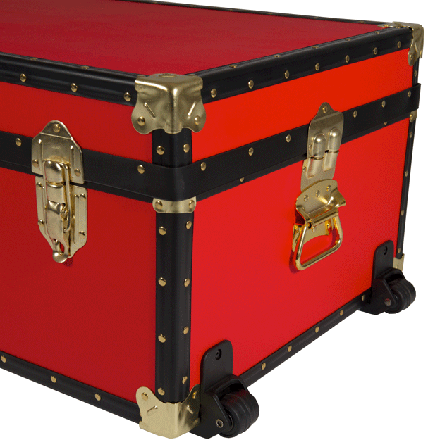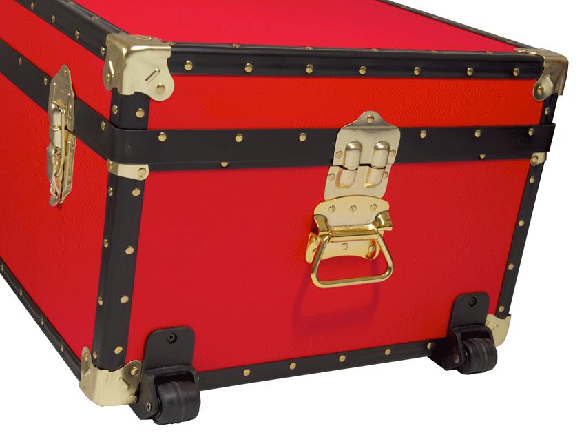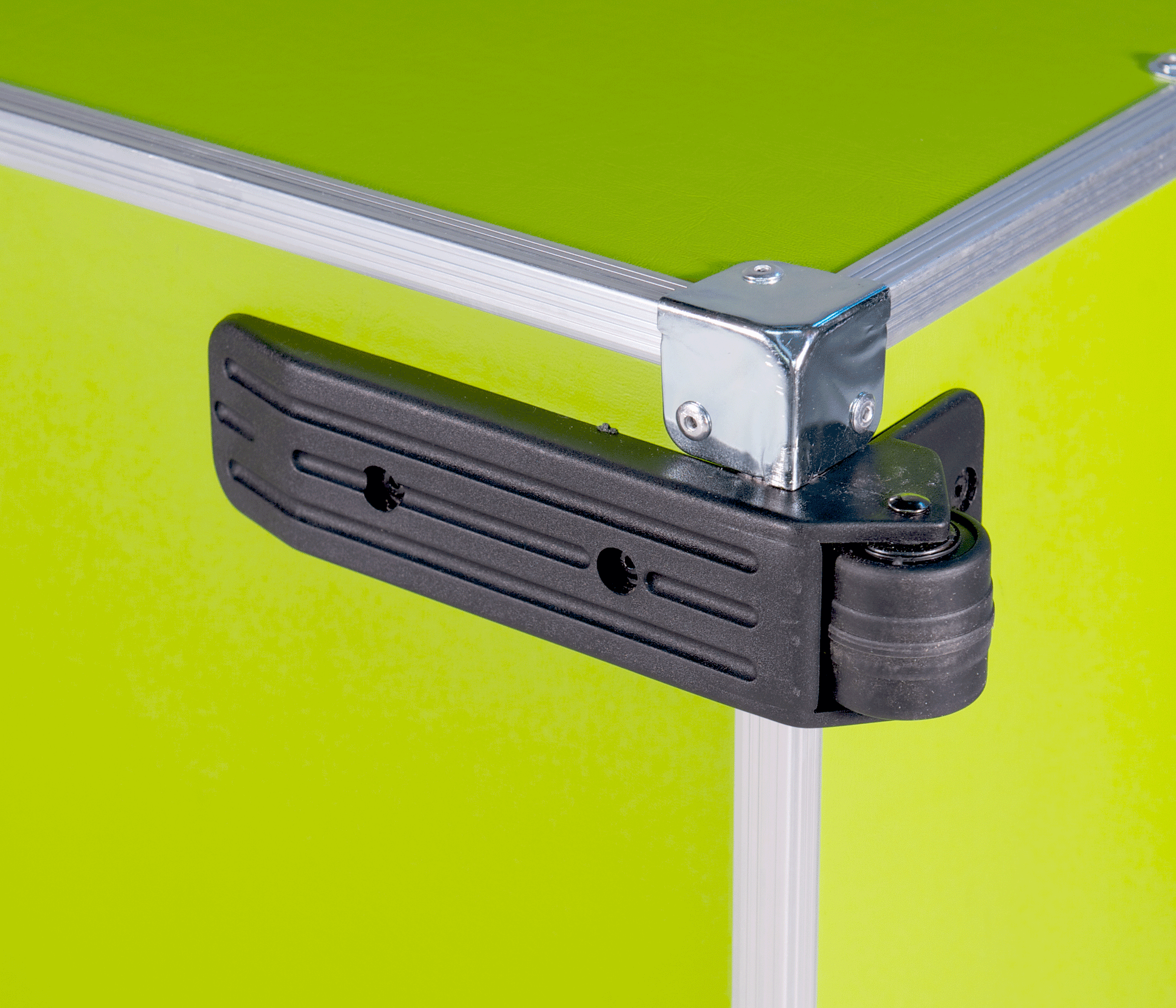Black Corner Wheels that engage when you lift your trunk up at one end by the fitted handle. Also supplied with small rubber feet for the opposite end to ensure your trunk sits flat when rested. Fixing bolts and T-Nuts can be supplied with this purchase. Can be fitted to any 30" plus size trunk. (Not recommended for Tuck Boxes or Stool boxes).