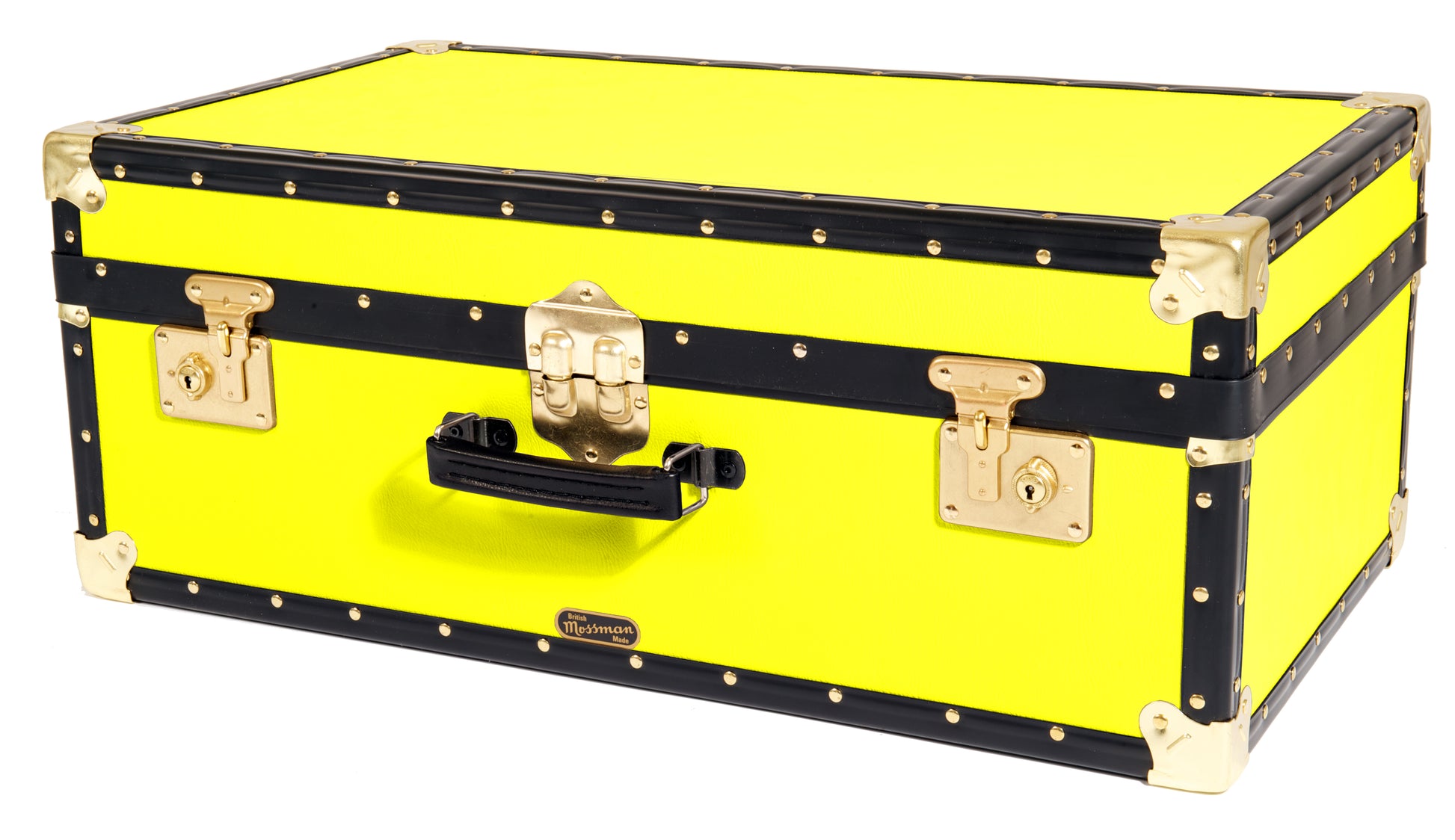 With two flip locks to the front of the trunk, a hinged stay lid, leather carry handle and a paper lined interior. Mossman Trunks is the number one choice in boarding school Tuck Boxes, luggage chests and storage trunk solutions.