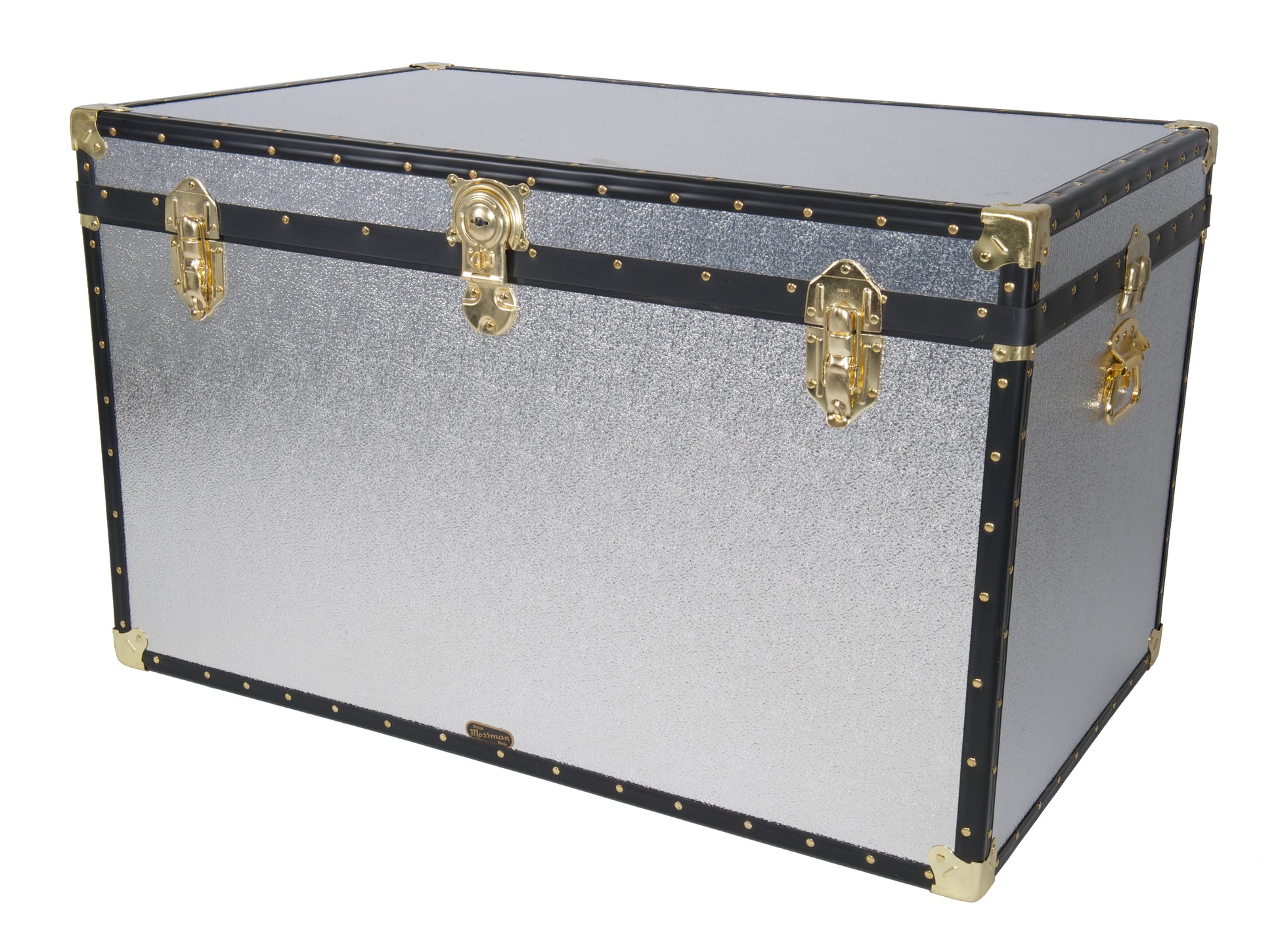 A shiny silver alloy alternative to our leathergrain range of tuck boxes and trunks. Each King Trunk is constructed by hand from the highest quality 5.5mm plywood, which is bonded to a stucco-effect aluminium covering for that industrial look. Thanks to its large size, the King Trunk is popular for equestrian use. Due to its large size, please check it will fit through your doorways & into your home before purchasing.