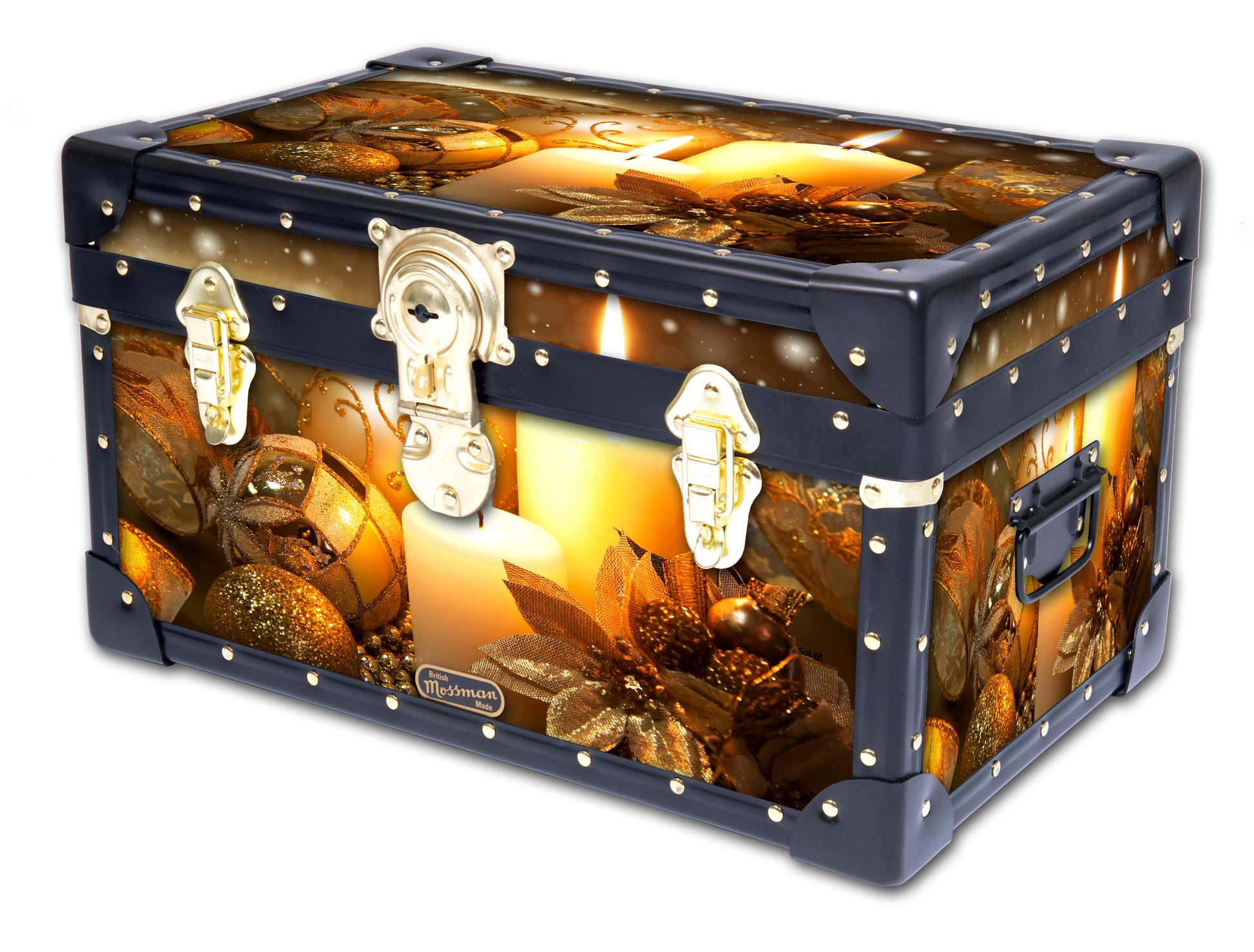A festive Christmas Candles Print traditional boarding school Tuck Box with Cabin Lock. Each Tuck Box is constructed by hand from the highest quality 5.5mm plywood, which is bonded to a Christmas themed Christmas Candles printed vinyl. Part of our Festive range of printed tuck boxes.