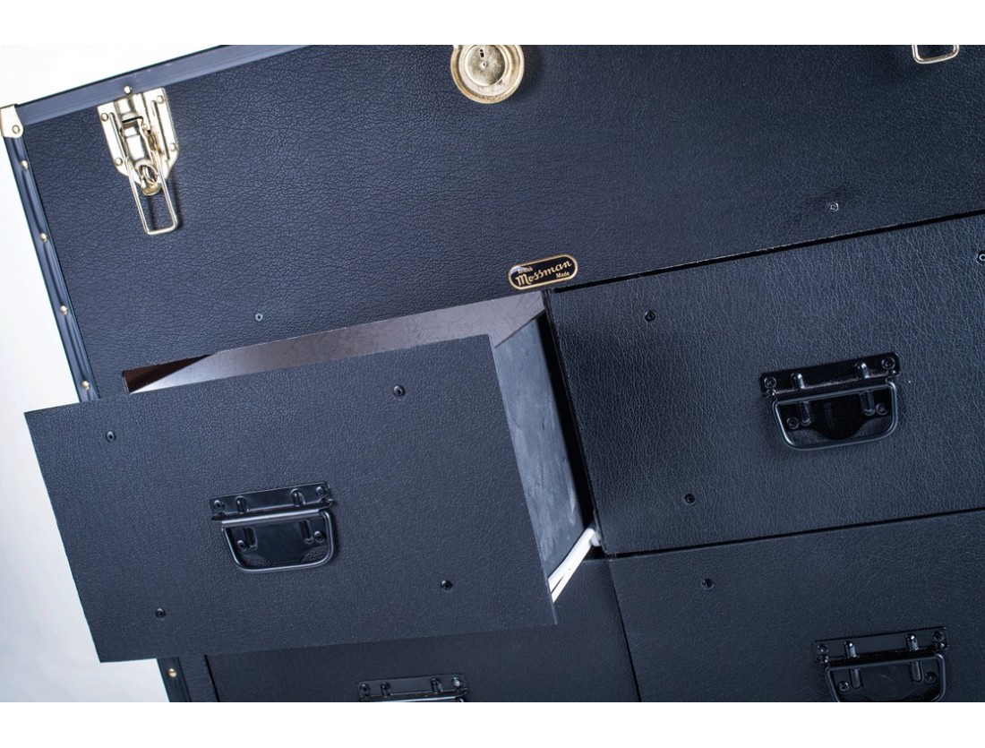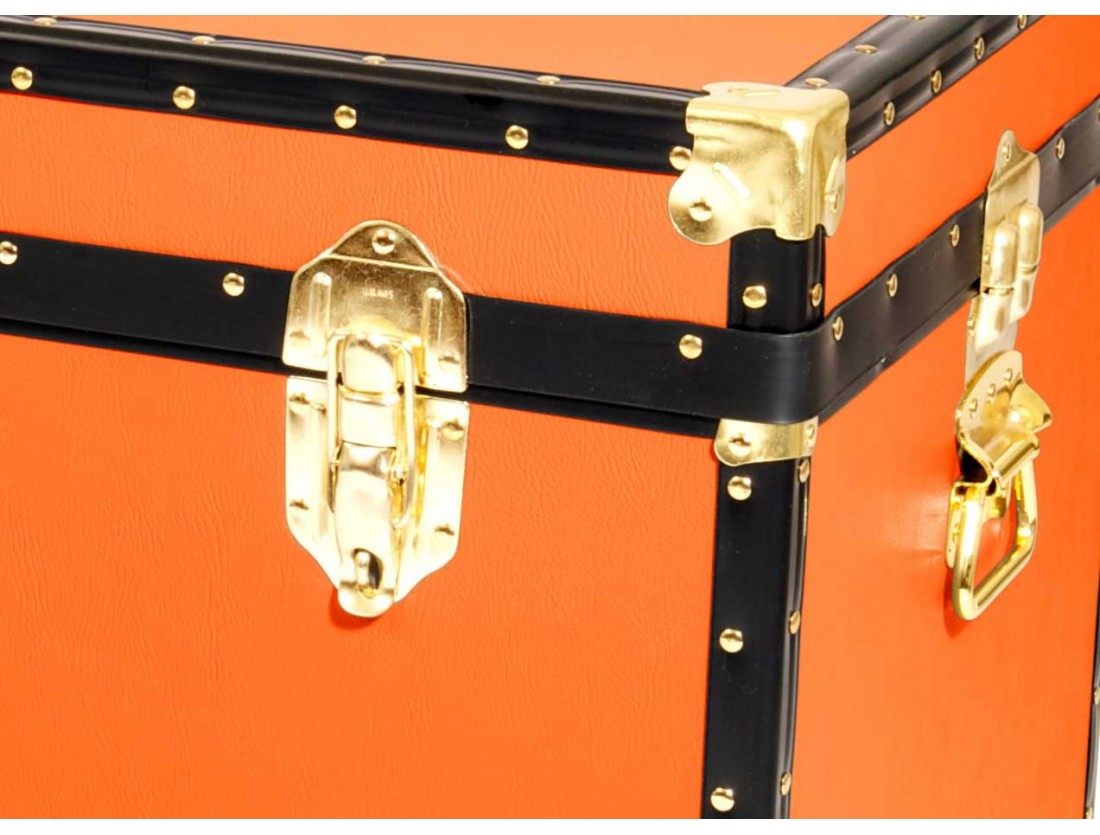 Constructed from the highest quality 5.5mm plywood, which is bonded to an orange coloured durable leather-grain effect PVC vinyl's. With 6 drawers and a top trunk section which features a hinged stay lid, Cabin lock and two further pad-lockable catches. Handles are fitted to each end to help you move this heavy furniture item. The interior is paper lined.