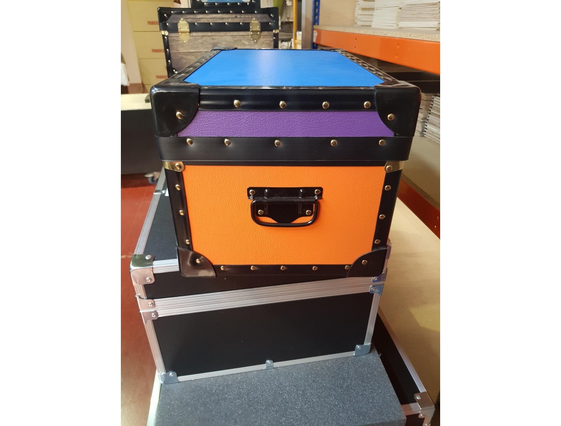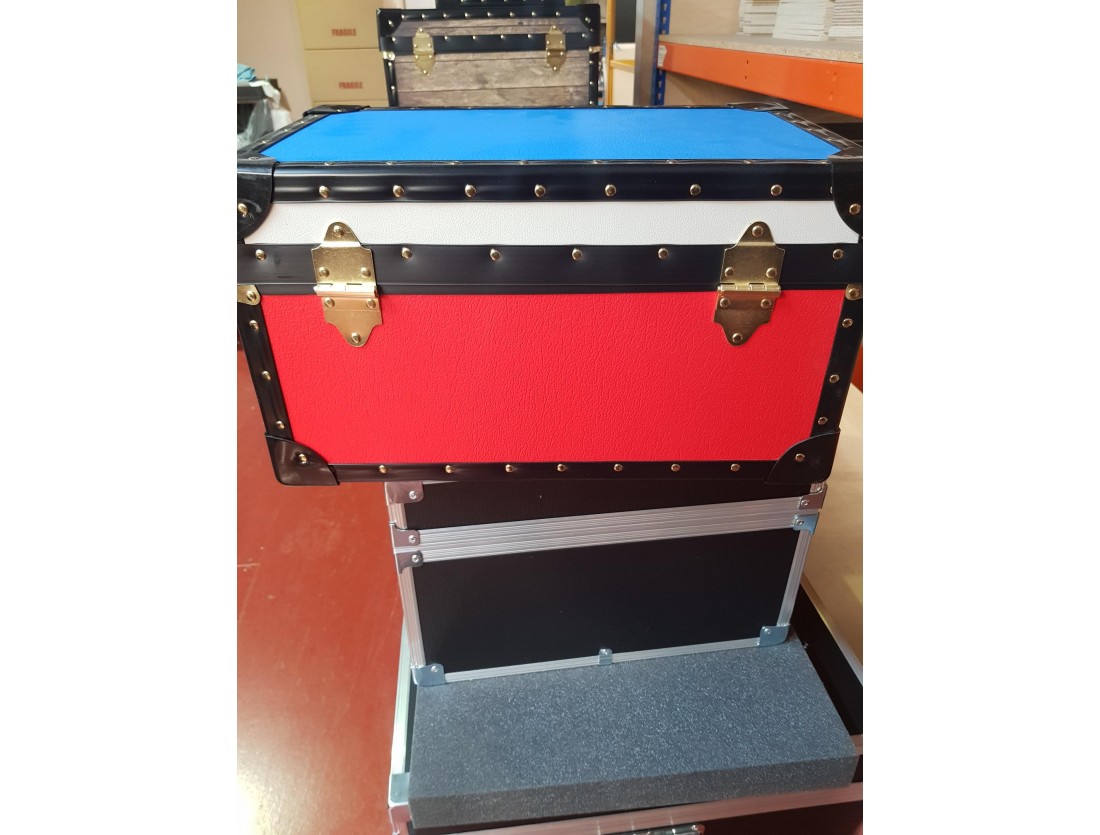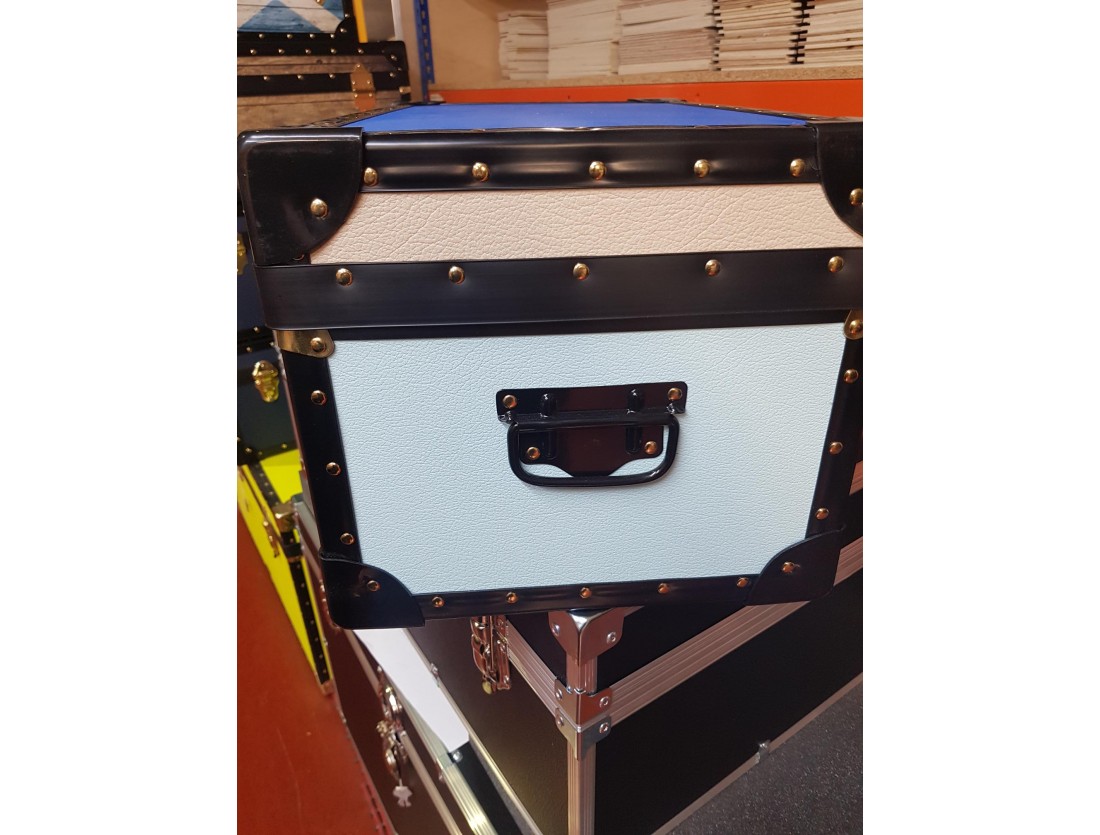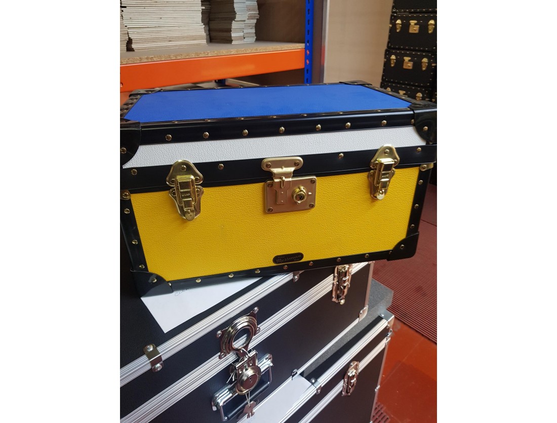 Constructed from the highest quality 5.5mm plywood, which is bonded to multiple colours of a durable leather-grain effect PVC vinyl.  With a hinged stay lid, carry handles each end, and two further pad-lockable catches.  The interior is paper lined.  Approximate internal dimensions 500mm x 300mm x 260mm. The number one choice in boarding school Tuck Boxes, luggage chests and storage trunk solutions.