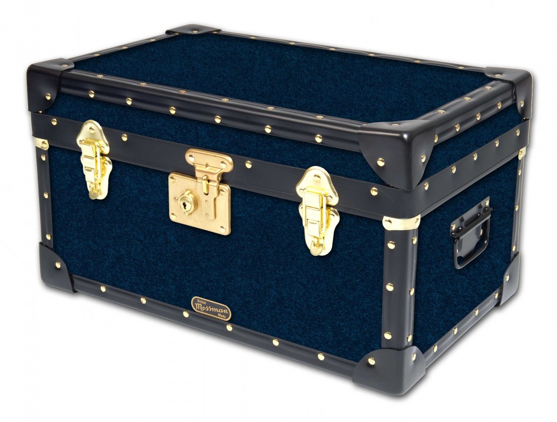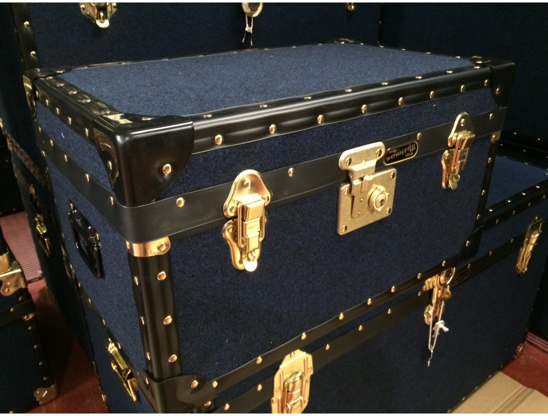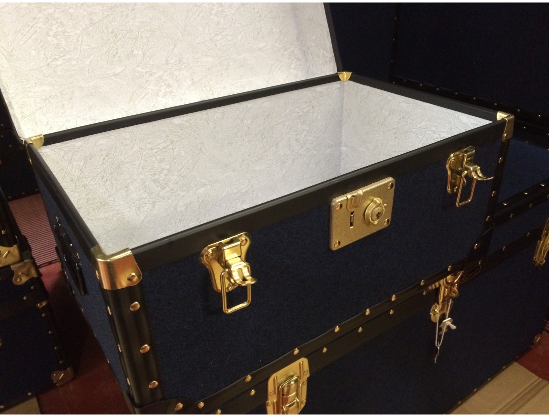 Dark blue carpet covered traditional boarding school steamer trunk with central cabin lock. Supplied with two keys. Approximate external dimensions 36" x 20" x 14". 159 litres capacity. 9kg in weight.