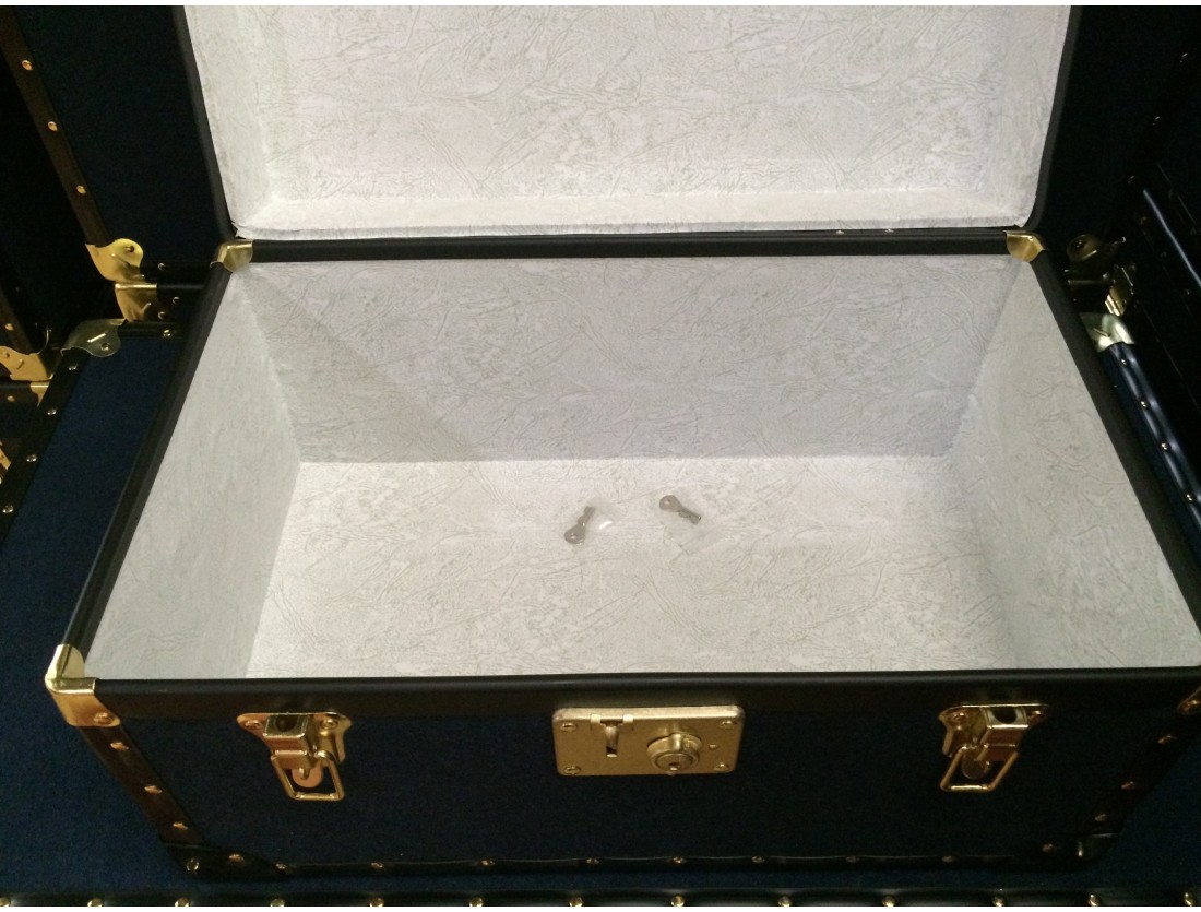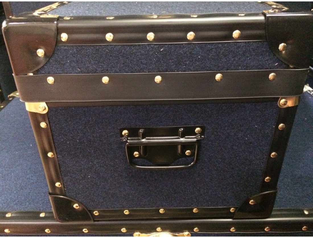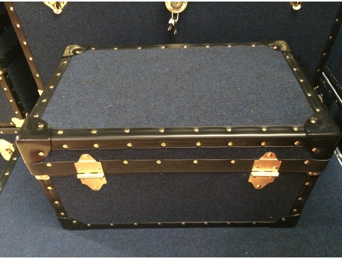 Dark blue carpet covered traditional cabin storage trunk with central cabin lock. Supplied with two keys. Approximate external dimensions 36" x 20" x 20". 227 litres capacity. 10kg in weight.