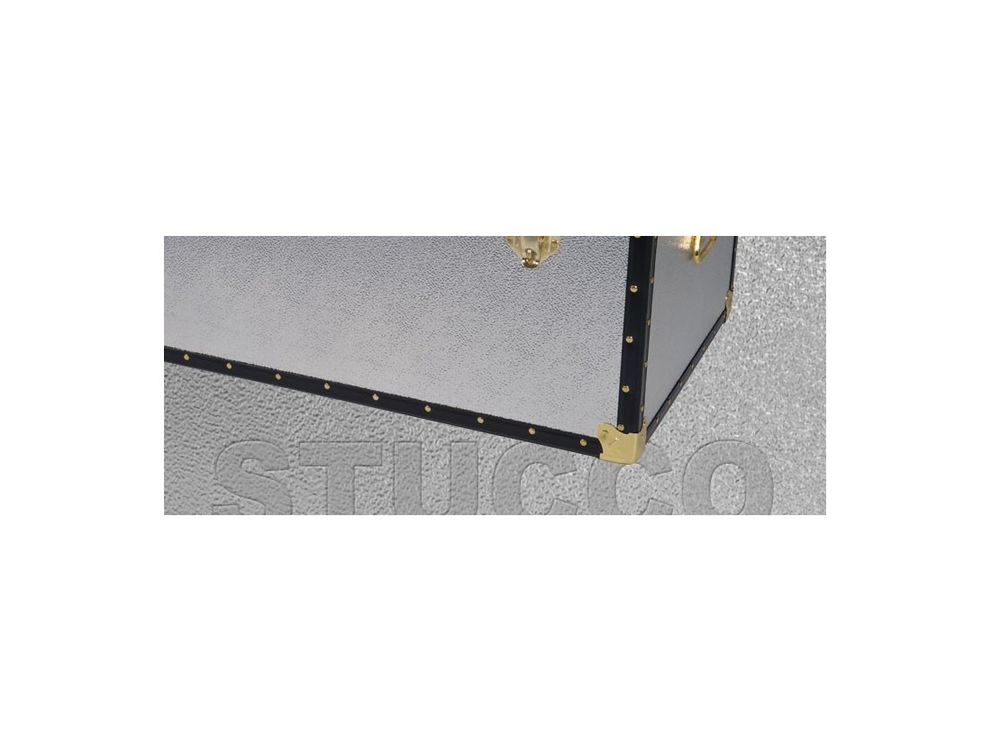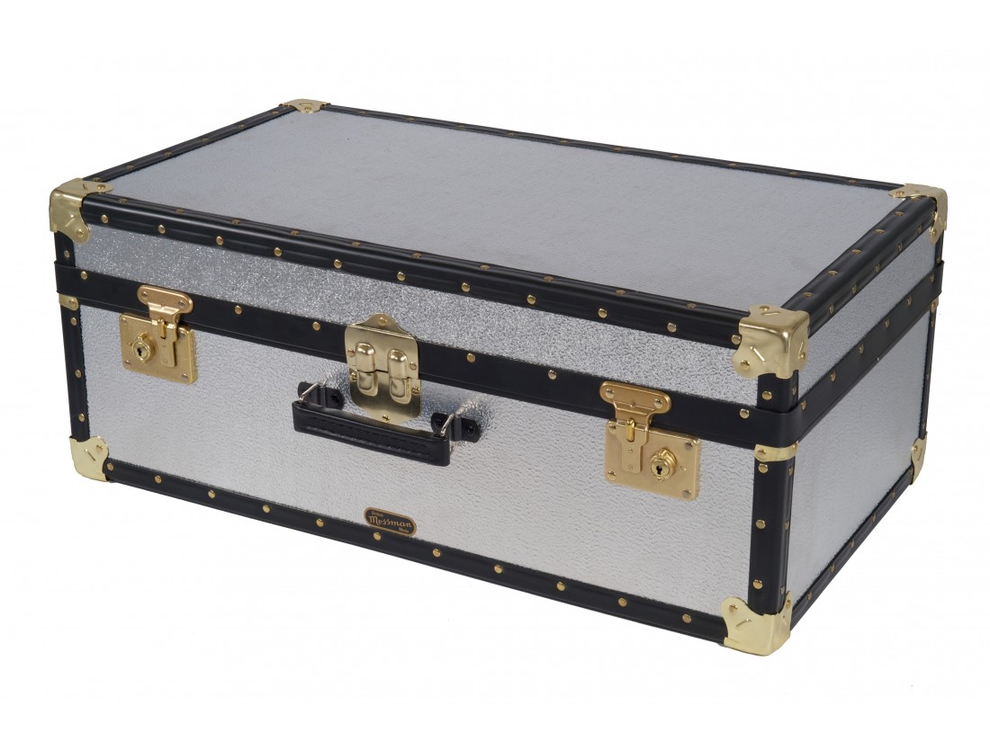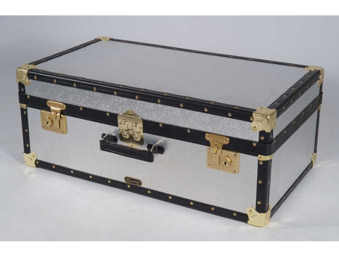 Traditional Attache luggage trunk with handed flip locks. Stucco effect aluminium covering for that industrial look. Supplied with two keys. Approximate external dimensions 30" x 17" x 11". 91 litres capacity. 7kg in weight.